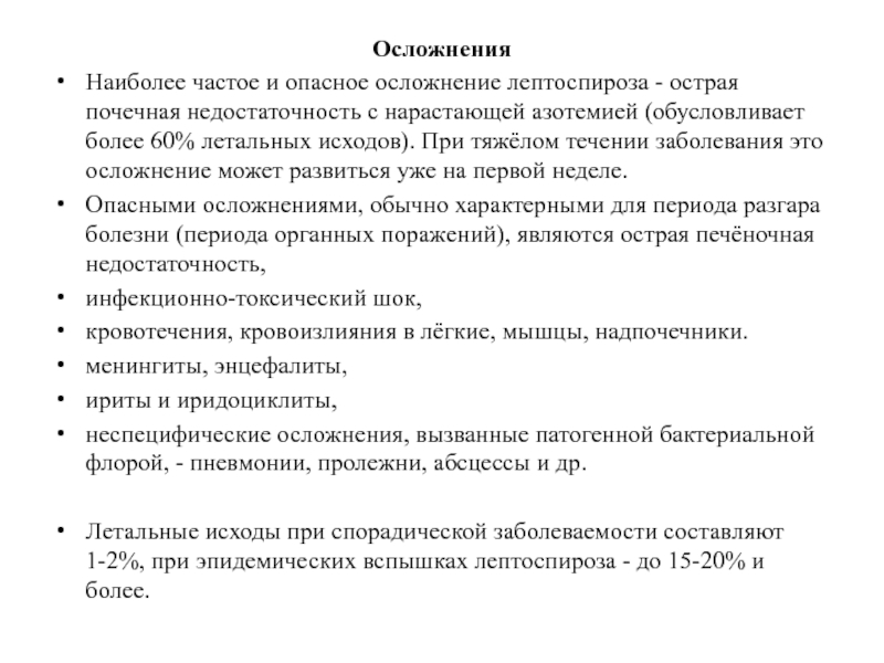 Летальные исходы при спорадической заболеваемости составляют 1-2%, при эпидемических вспышках лептоспироза - до 15-20% и более.