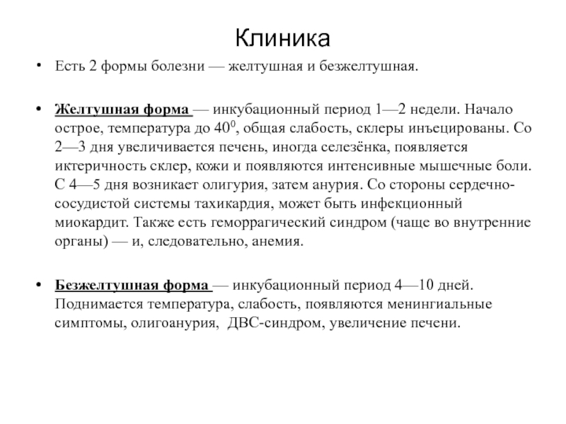 Безжелтушная форма — инкубационный период 4—10 дней. Поднимается температура, слабость, появляются менингиальные симптомы, олигоанурия, ДВС-синдром, увеличение печени.