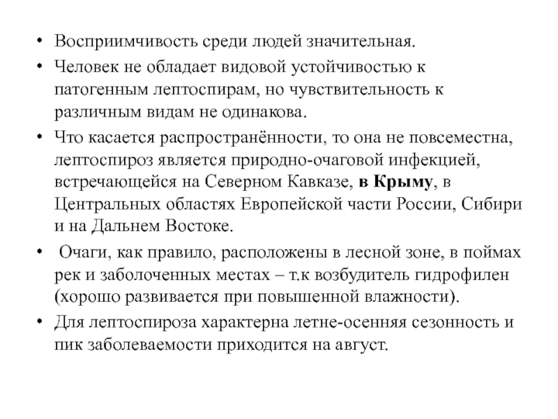 касается распространённости, то она не повсеместна, лептоспироз является природно-очаговой инфекцией, встречающейся на Северном Кавказе, в Крыму, в Центральных областях Европейской части России, Сибири и на Дальнем Востоке.