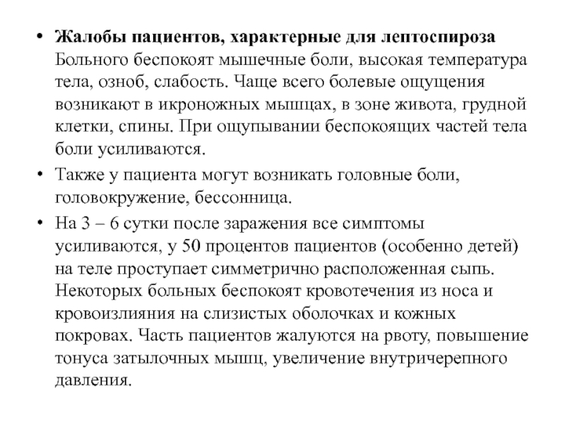 Слайд 38Жалобы пациентов, характерные для лептоспироза