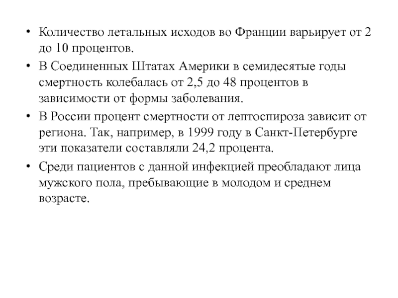 В России процент смертности от лептоспироза зависит от региона. Так, например, в 1999 году в Санкт-Петербурге эти показатели составляли 24,2 процента.