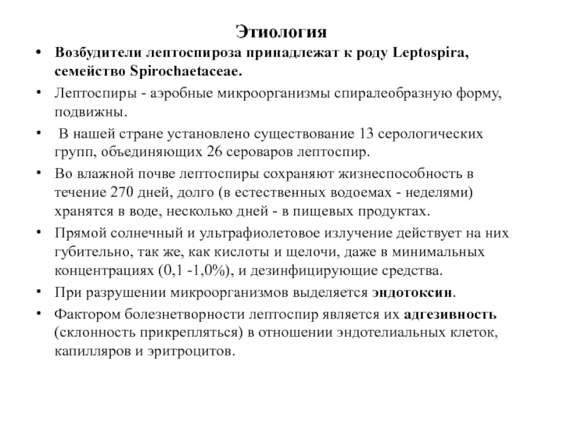 Возбудители лептоспироза принадлежат к роду Leptospira, семейство Spirochaetaceae.