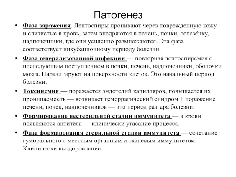 Фаза генерализованной инфекции — повторная лептоспиремия с последующим поступлением в почки, печень, надпочечники, оболочки мозга. Паразитируют на поверхности клеток. Это начальный период болезни.