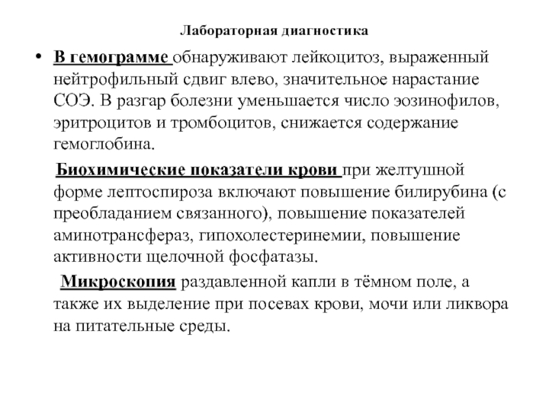 Биохимические показатели крови при желтушной форме лептоспироза включают повышение билирубина (с преобладанием связанного), повышение показателей аминотрансфераз, гипохолестеринемии, повышение активности щелочной фосфатазы.