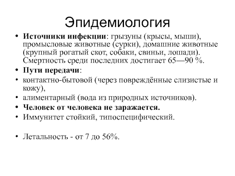 Источники инфекции: грызуны (крысы, мыши), промысловые животные (сурки), домашние животные