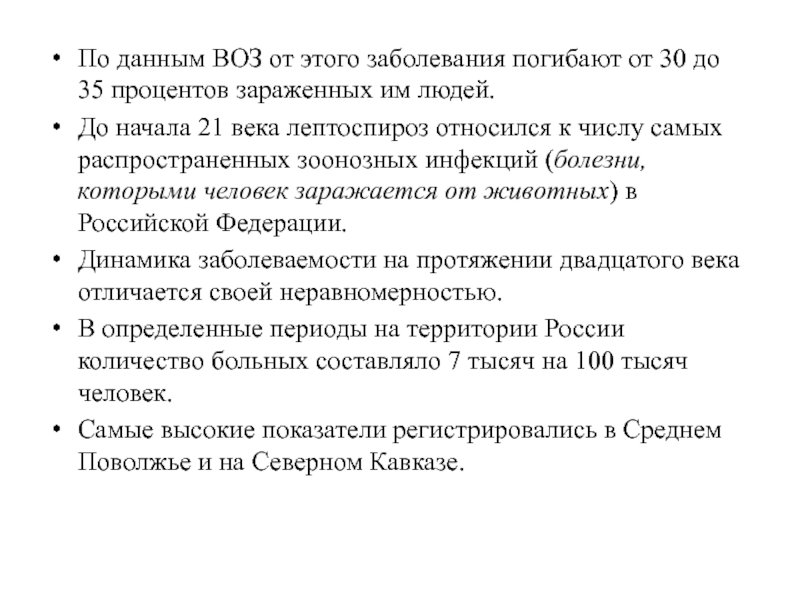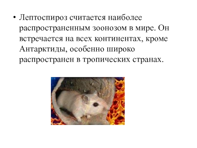 Слайд 4Лептоспироз считается наиболее распространенным зоонозом в мире. Он встречается на