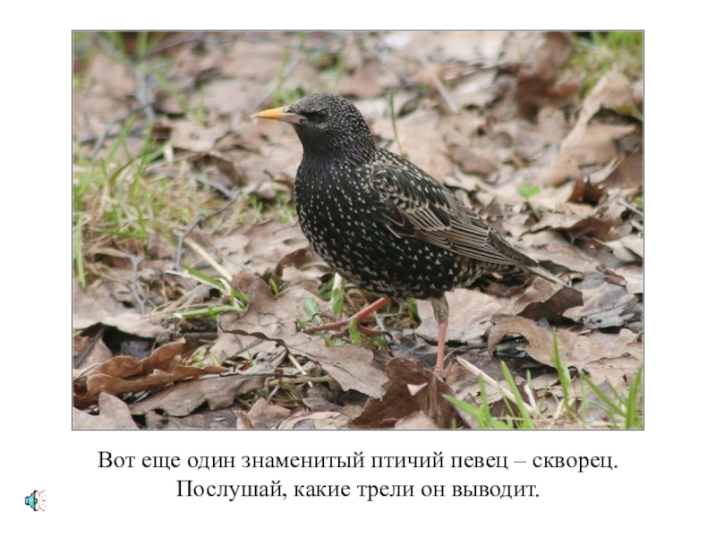 Вот еще один знаменитый птичий певец – скворец.Послушай, какие трели он выводит.