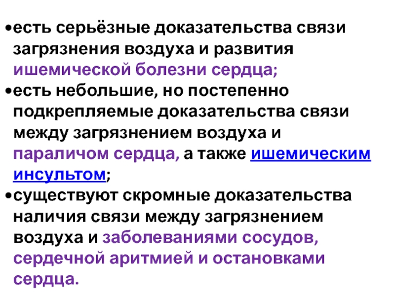 существуют скромные доказательства наличия связи между загрязнением воздуха и заболеваниями сосудов, сердечной аритмией и остановками сердца.