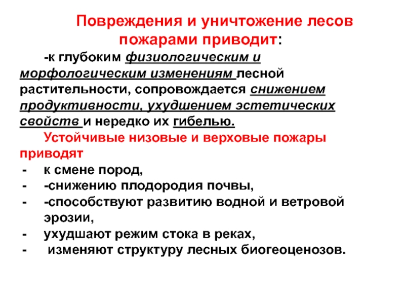 Слайд 3 Повреждения и уничтожение лесов пожарами приводит: