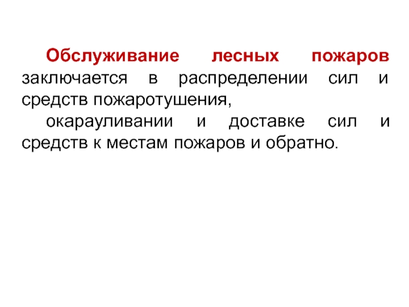 Слайд 43Обслуживание лесных пожаров заключается в распределении сил и средств пожаротушения,
