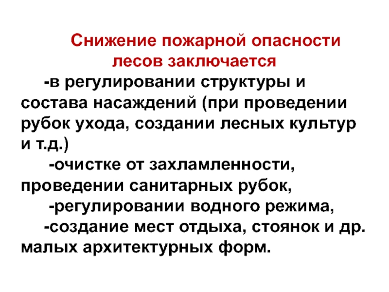 Слайд 38Снижение пожарной опасности лесов заключается