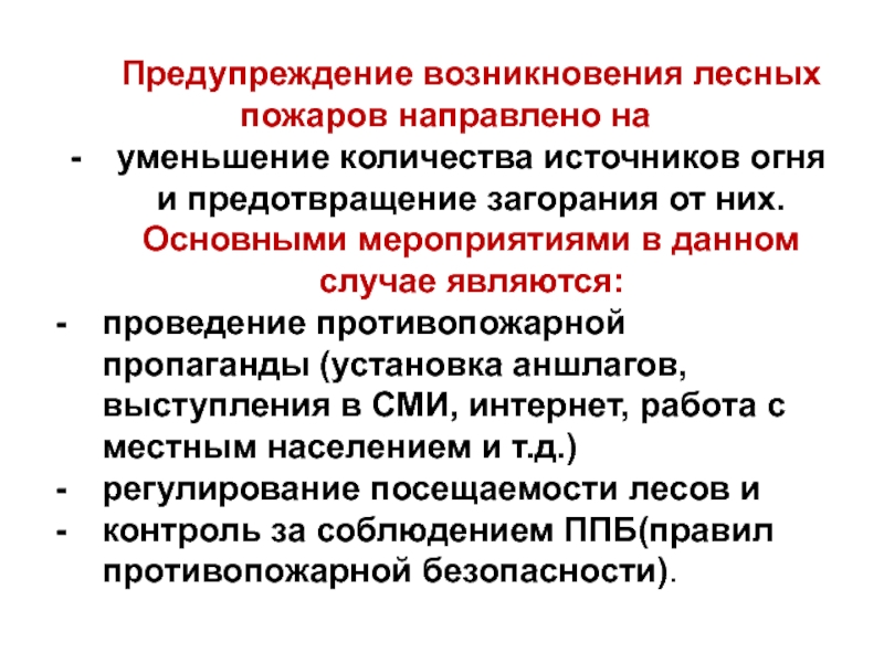 Слайд 39Предупреждение возникновения лесных пожаров направлено на