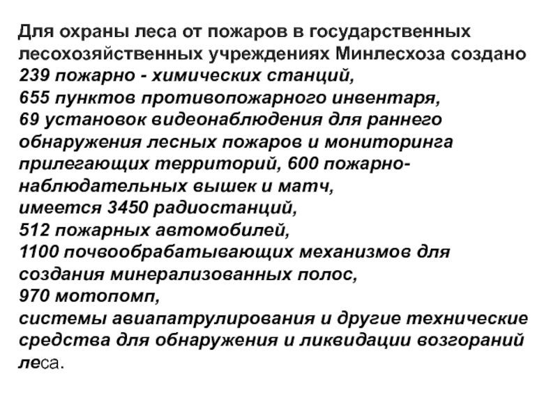 Слайд 29Для охраны леса от пожаров в государственных лесохозяйственных учреждениях Минлесхоза