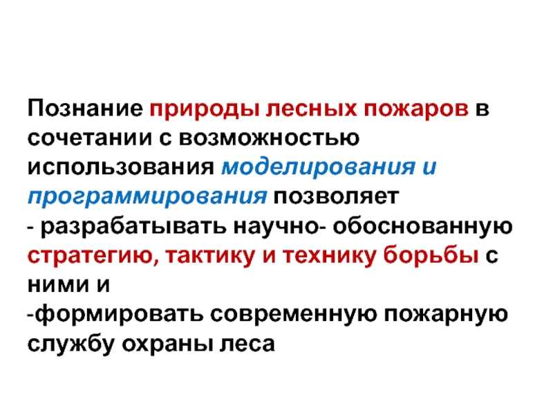 Слайд 14Познание природы лесных пожаров в сочетании с возможностью использования моделирования