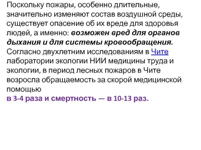 Согласно двухлетним исследованиям в Чите лаборатории экологии НИИ медицины труда и экологии, в период лесных пожаров в Чите возросла обращаемость за скорой медицинской помощью