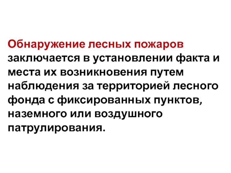 Слайд 41Обнаружение лесных пожаров заключается в установлении факта и места их