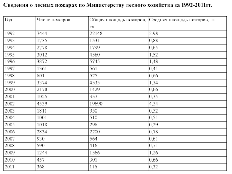 Слайд 11Сведения о лесных пожарах по Министерству лесного хозяйства за 1992-2011гг.
