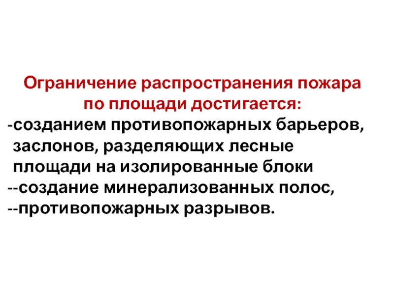 Слайд 40Ограничение распространения пожара по площади достигается: