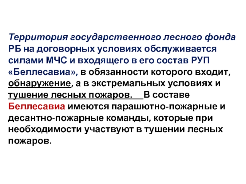Слайд 30Территория государственного лесного фонда РБ на договорных условиях обслуживается силами