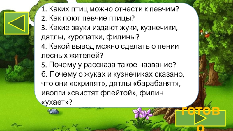 дрозды. Скрипят жуки и кузнечики. Барабанят дятлы. Свистят флейтой иволги.