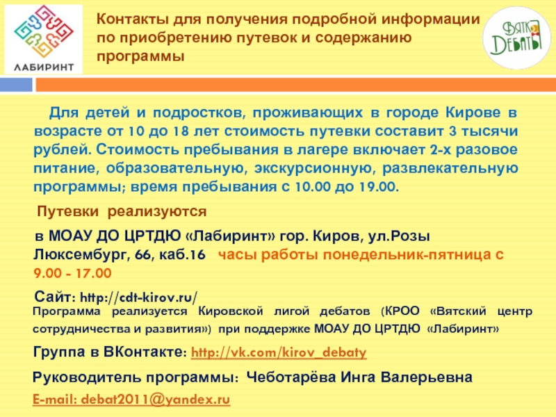 Программа реализуется Кировской лигой дебатов (КРОО «Вятский центр сотрудничества и развития») при поддержке МОАУ ДО ЦРТДЮ «Лабиринт»