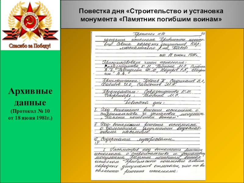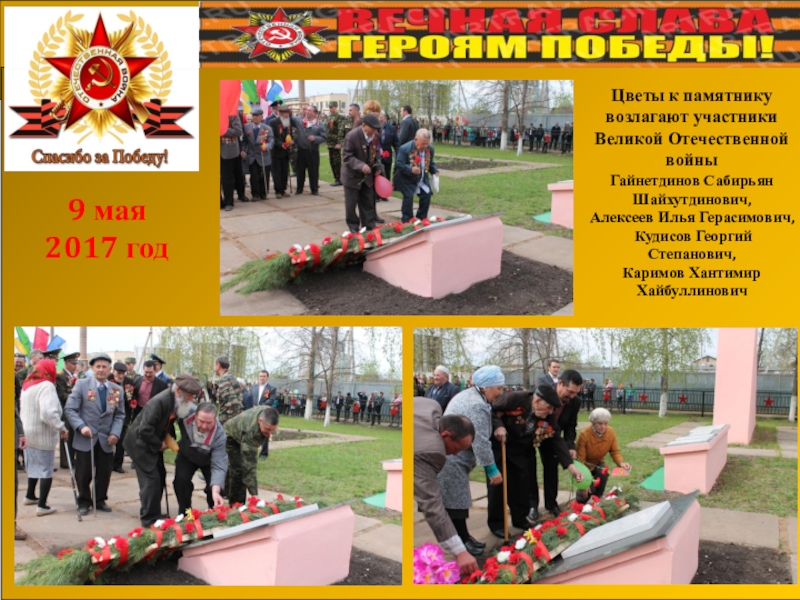 Благодаря большой помощи и активного участия директоров заводов ГайнуллинаФ.М., Смагина В.М., замдиректора Козлова Е.В., председателя поссовета Сиразетдиновой К.М., нач.военно-учетного стола Хуснутдинова Г.Ф., нач.подстанции Самойлова П.Г., Директора школы Назырова Р.Л., учителей и учащихся, пионервожатых средней школы, председателей профкомов заводов Сивова B.C., Курмышева А.Н., секретарей комсомольских организаций Равилова Н.С., Галиуллиной P.M., руководителя цеха агрегатного завода Сапожкова М.А. и других организаций и лиц.