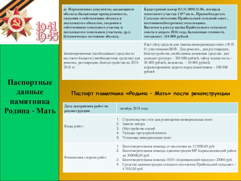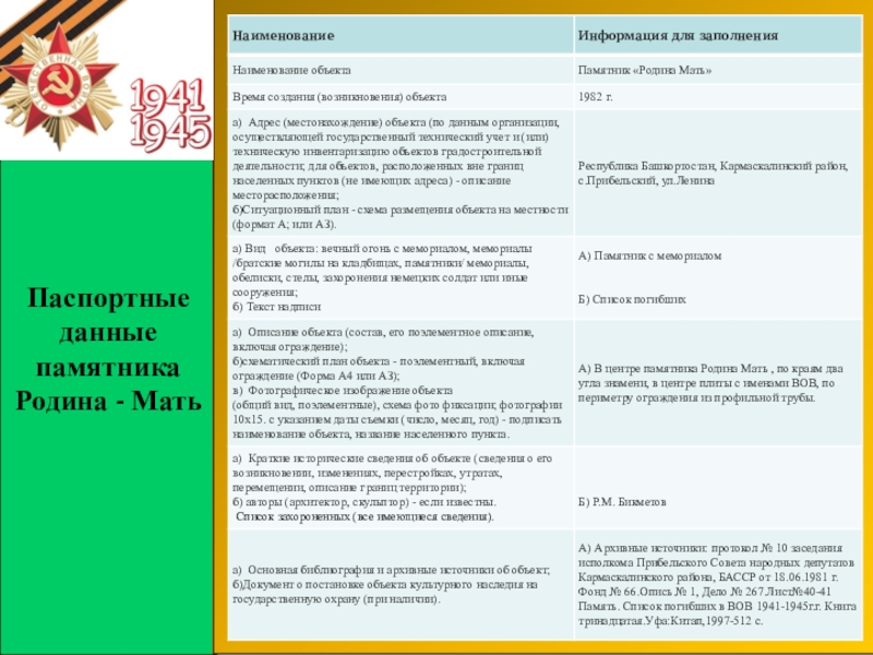 Паспорт памятника «Родина – Мать» после