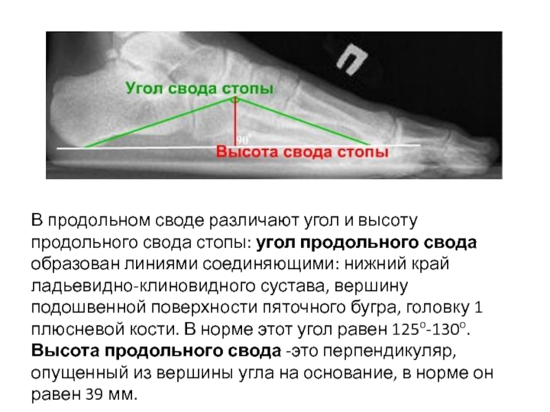 Слайд 9В продольном своде различают угол и высоту продольного свода стопы:
