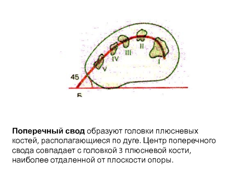 Слайд 10Поперечный свод образуют головки плюсневых костей, располагающиеся по дуге. Центр