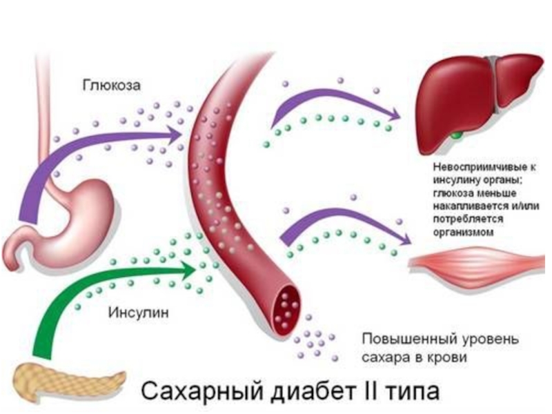 крови может быть даже его избыток, но организм из-за снижения чувствительности к нему и к глюкозе не реагирует адекватно с образованием гликогена в мышцах и печени