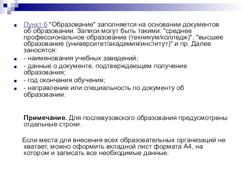 Слайд 8Пункт 6 "Образование" заполняется на основании документов об образовании. Записи