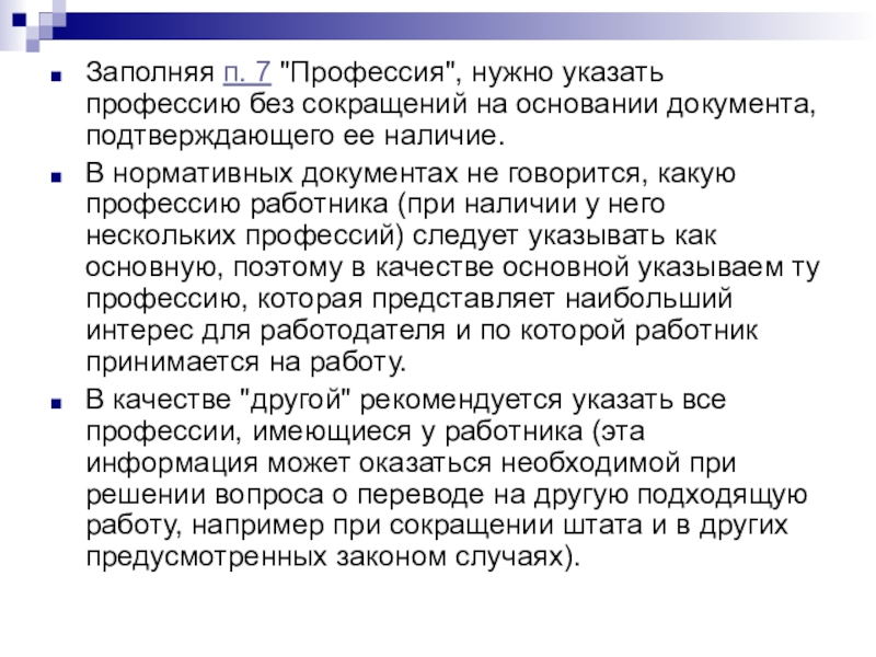 Слайд 9Заполняя п. 7 "Профессия", нужно указать профессию без сокращений на основании