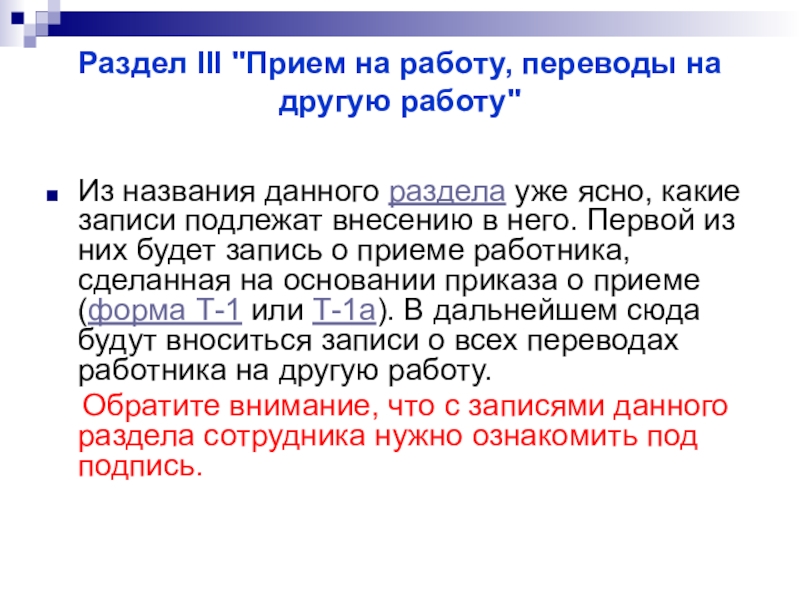 Слайд 13Раздел III "Прием на работу, переводы на другую работу"