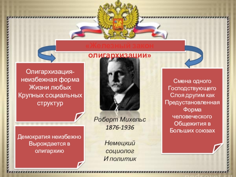 Олигархизация-неизбежная формаЖизни любыхКрупных социальных структурДемократия неизбежноВырождается в олигархиюСмена одного ГосподствующегоСлоя другим как ПредустановленнаяФорма человеческогоОбщежития в Больших союзахРоберт