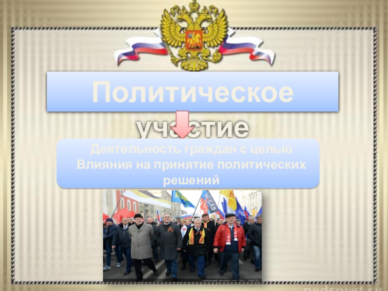Политическое участиеДеятельность граждан с цельюВлияния на принятие политическихрешений