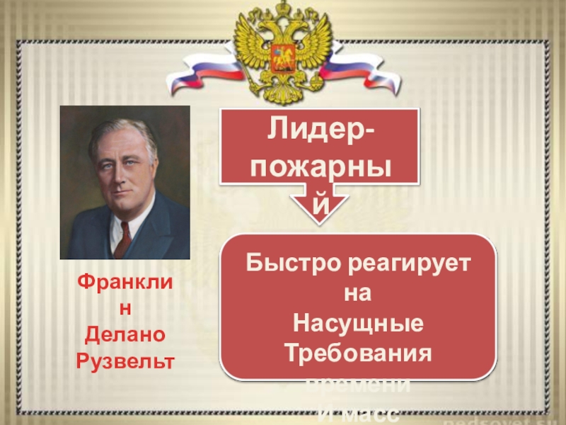 Лидер-пожарныйБыстро реагирует наНасущныеТребования времениИ масс ФранклинДеланоРузвельт