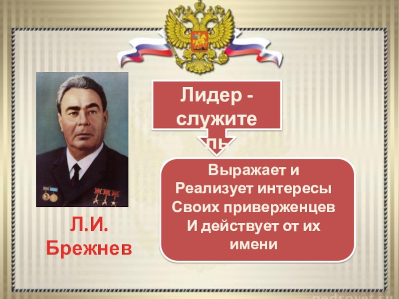 Лидер -служительВыражает и Реализует интересыСвоих приверженцевИ действует от ихимениЛ.И.Брежнев