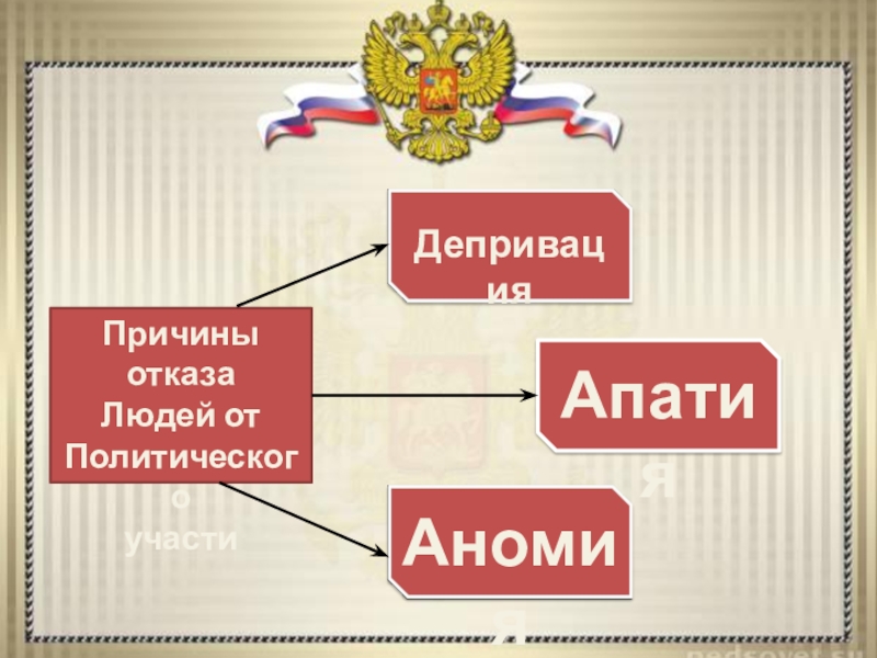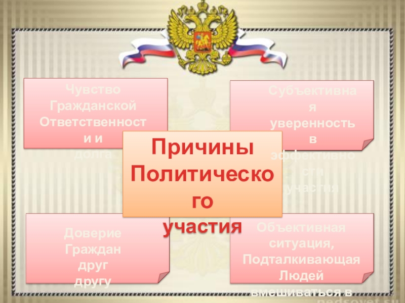 ПричиныПолитическогоучастияЧувствоГражданскойОтветственности и долгаСубъективнаяуверенность вэффективностиучастияДовериеГраждан другдругуОбъективная ситуация,ПодталкивающаяЛюдей вмешиваться вПолитические дела