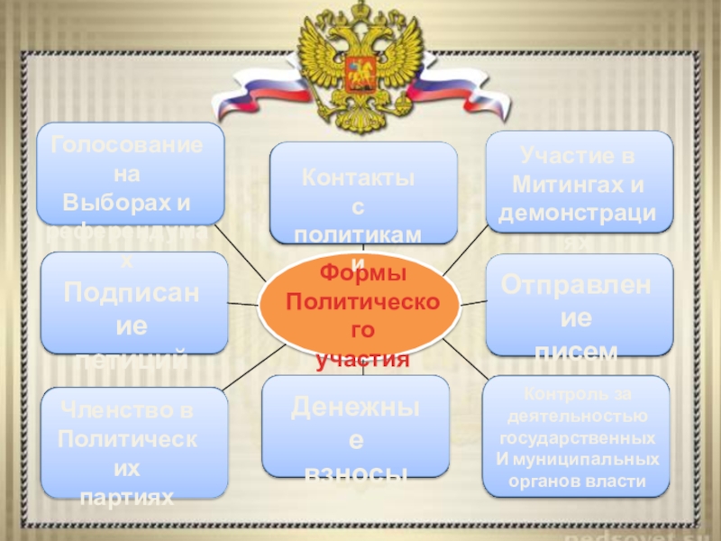 Голосование на Выборах иреферендумахКонтакты с политикамиУчастие в Митингах и демонстрацияхПодписаниепетицийЧленство в ПолитическихпартияхДенежныевзносыКонтроль задеятельностьюгосударственныхИ муниципальныхорганов властиОтправлениеписемФормыПолитическогоучастия