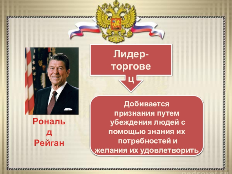 РональдРейганЛидер-торговецДобиваетсяпризнания путем убеждения людей спомощью знания их потребностей ижелания их удовлетворить
