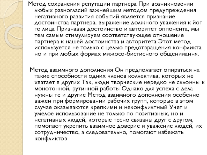 Слайд 24Метод сохранения репутации партнера При возникновении любых разногласий важнейшим методом