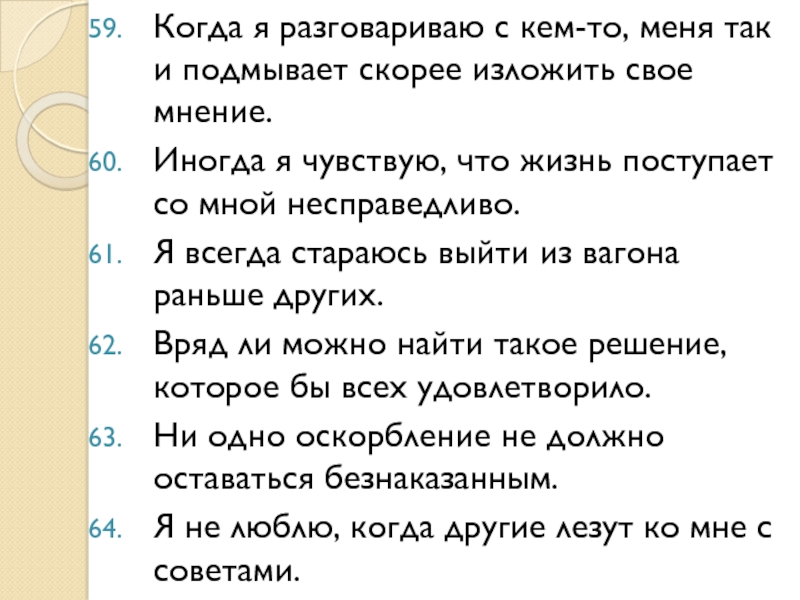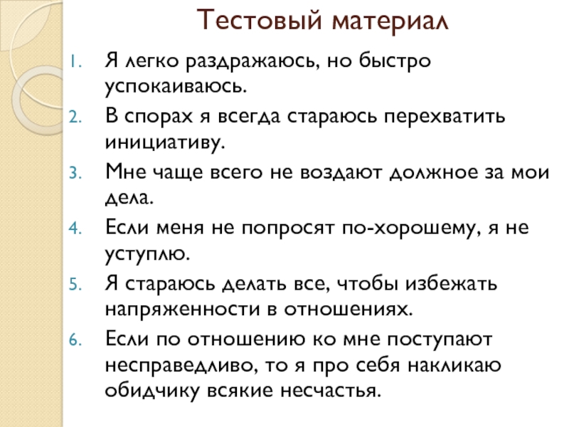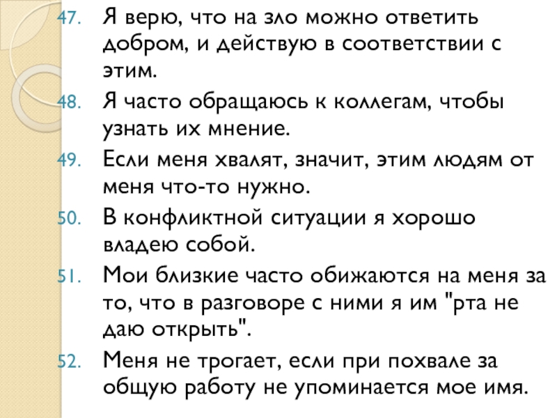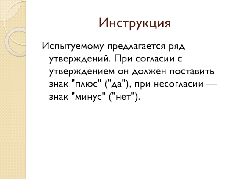 Испытуемому предлагается ряд утверждений. При согласии с утверждением он должен