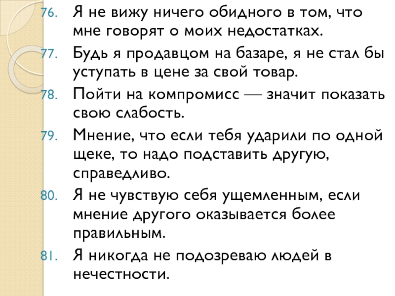 Ответы "да" по позициям 4, 12, 20, 28, 36, 60, 76 и ответы "нет" по позициям 44, 52, 68 свидетельствуют о склонности к неуступчивости.