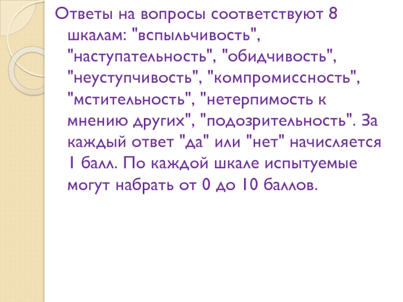 Слайд 18Ответы на вопросы соответствуют 8 шкалам: "вспыльчивость", "наступательность", "обидчивость", "неуступчивость",