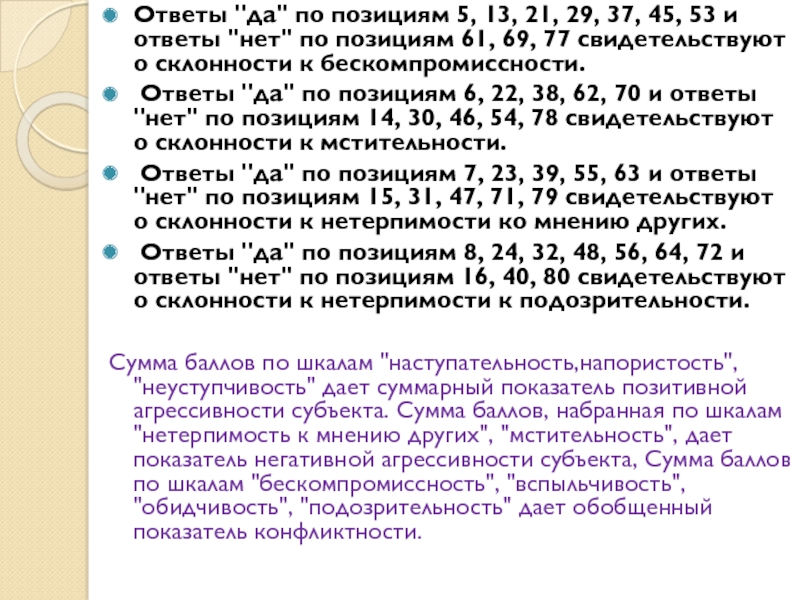 Сумма баллов по шкалам "наступательность,напористость", "неуступчивость" дает суммарный показатель позитивной агрессивности субъекта. Сумма баллов, набранная по шкалам "нетерпимость к мнению других", "мстительность", дает показатель негативной агрессивности субъекта, Сумма баллов по шкалам "бескомпромиссность", "вспыльчивость", "обидчивость", "подозрительность" дает обобщенный показатель конфликтности.