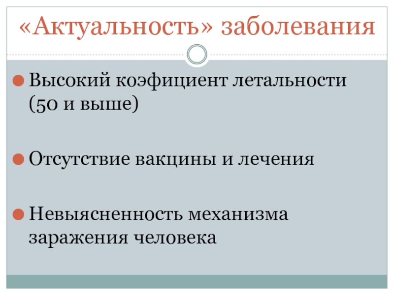 «Актуальность» заболеванияВысокий коэфициент летальности (50 и выше)Отсутствие вакцины и леченияНевыясненность механизма заражения человека