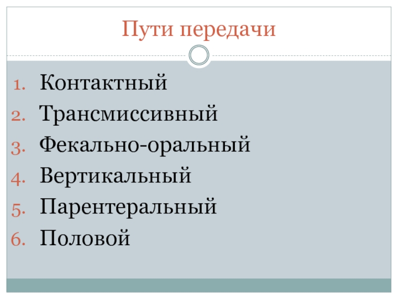 Пути передачиКонтактныйТрансмиссивныйФекально-оральныйВертикальныйПарентеральныйПоловой