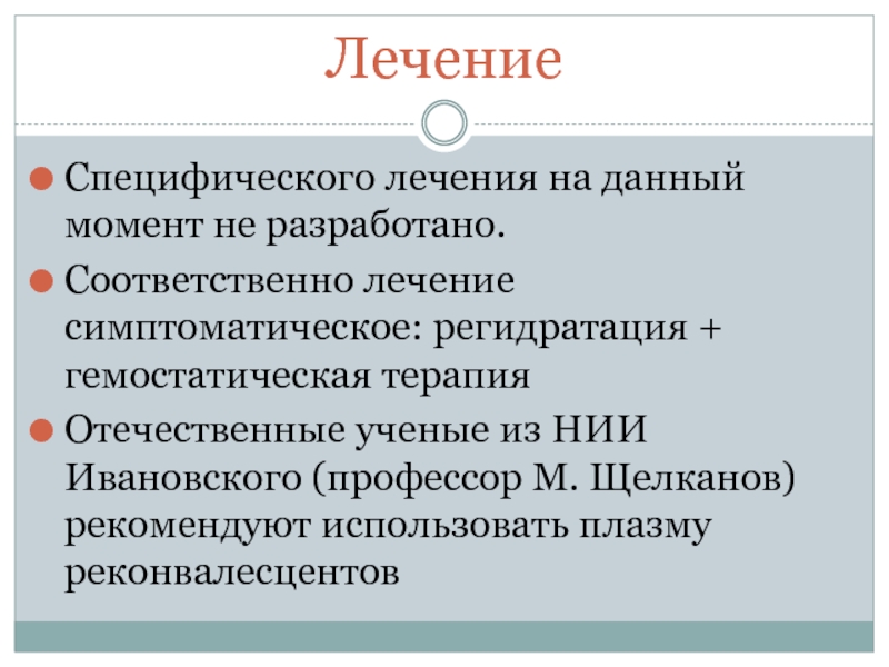 ЛечениеСпецифического лечения на данный момент не разработано.Соответственно лечение симптоматическое: регидратация + гемостатическая терапияОтечественные ученые из НИИ Ивановского