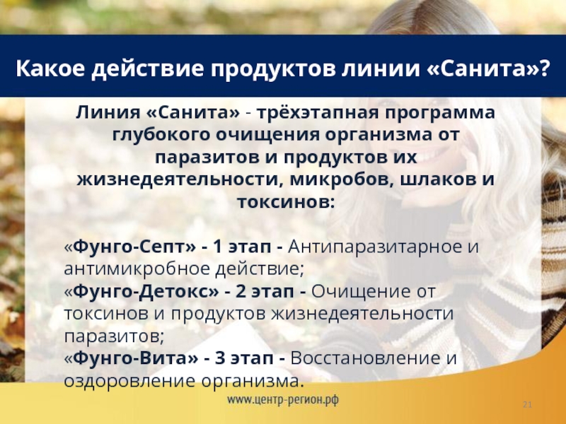 Проходить профилактический курс полезно для здоровья, т.к. 3-х этапная программа глубокой очистки продуктами линии «Санита» благоприятно влияет на организм в целом.