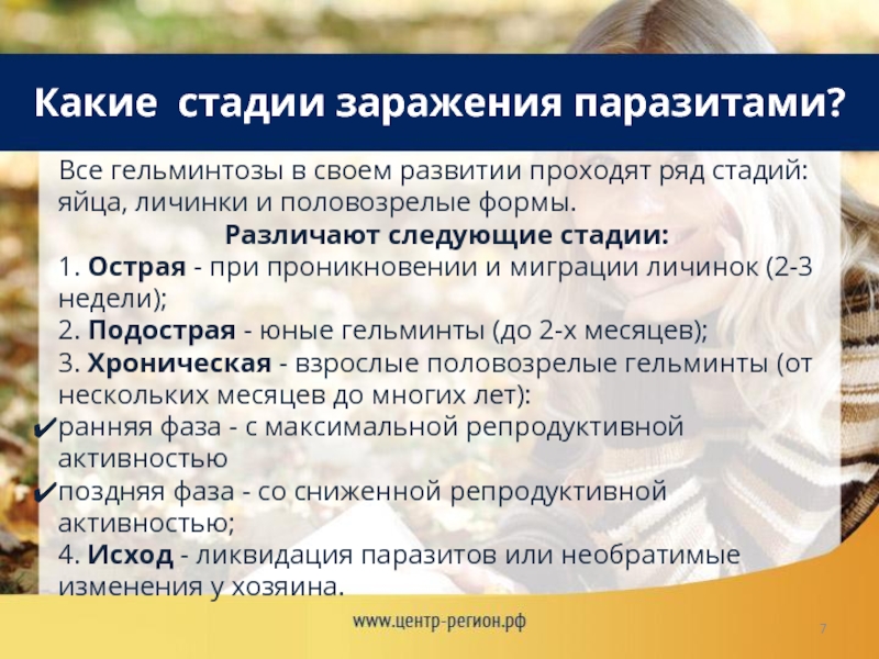 Особенность большинства паразитарных болезней - длительное, многолетнее присутствие возбудителя в организме больного (при отсутствии специфического лечения);